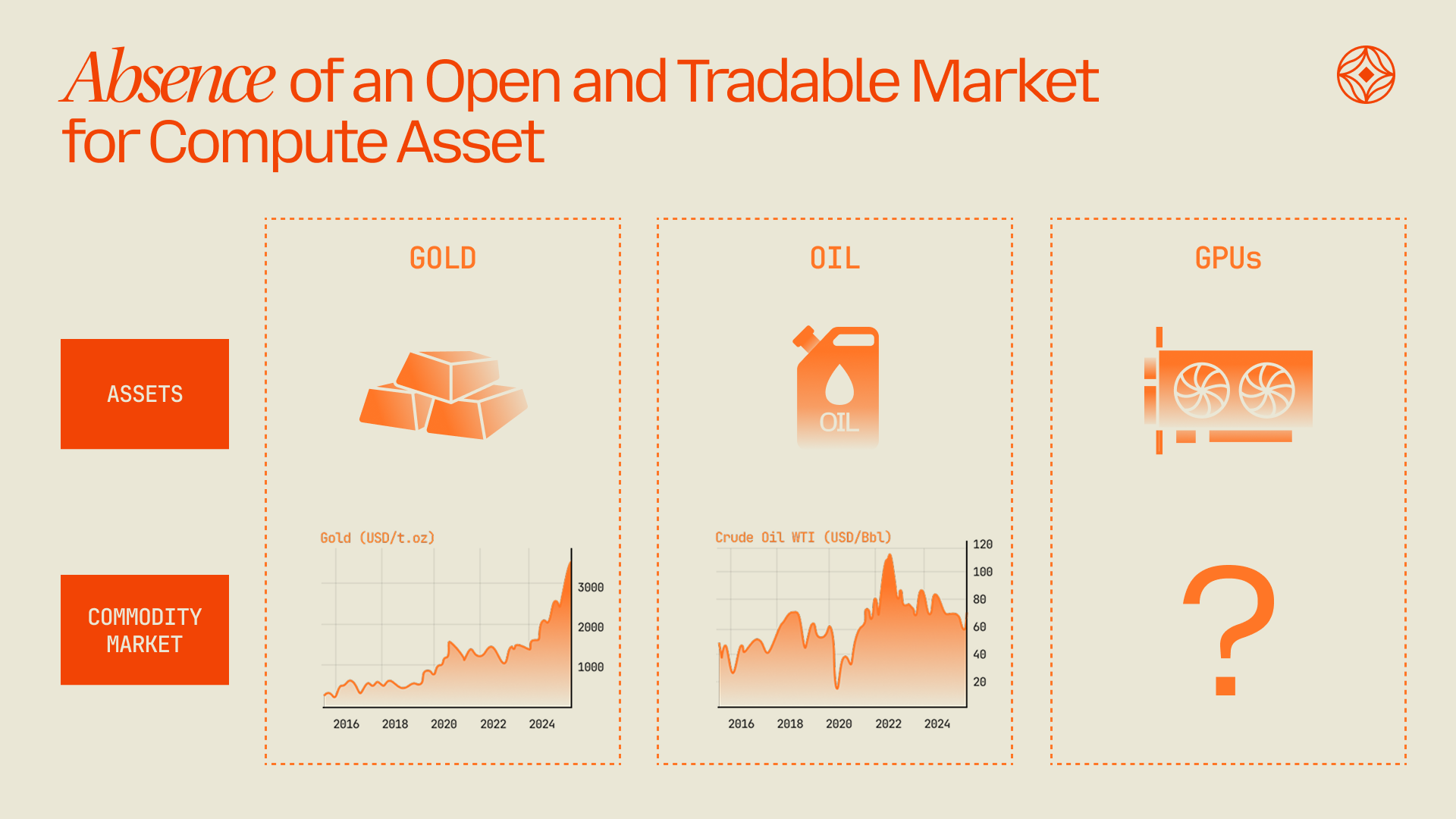 Compute as commodities is like gold before the 1970s, lacking a liquid, transparent, and efficient market. Compute assets such as enterprise-grade GPUs are in extremely high demand but cannot be traded or leveraged effectively, limiting their economic value proposition.