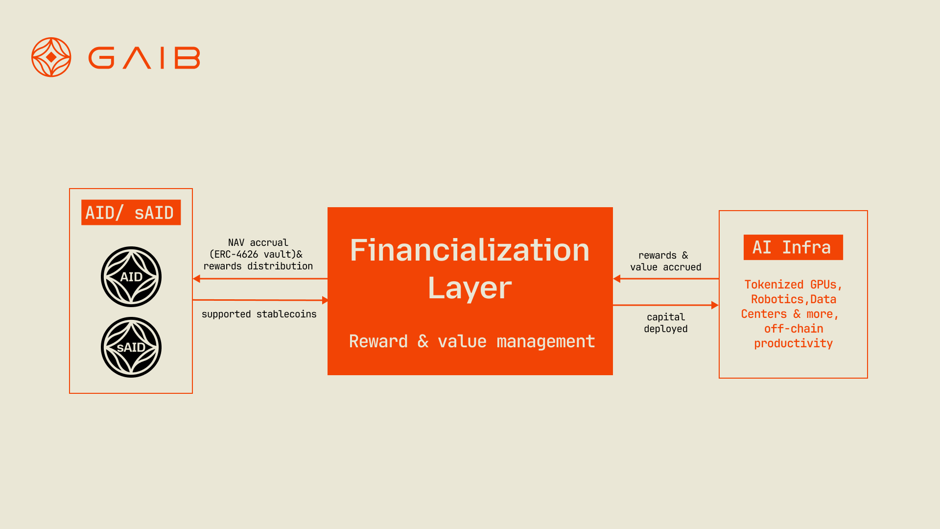 AI Dollar (AID) is the first product built on GAIB’s economic layer, designed as a synthetic dollar fully backed by the U.S. treasury and stable assets. sAID (staked AID) is the receipt token issued when AID is staked into GAIB’s ERC-4626 vaults, representing the proportional ownership in GAIB’s diversified portfolio of real-world AI compute infra & Robotics financing deals and a reserve of treasury bills. Through sAID, investors gain direct exposure to real-world AI infra with sustainable AI-driven yields, while preserving liquidity to enable broader participation across DeFi markets.