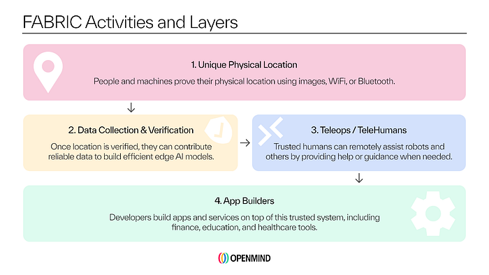 With trust, we need verifiability so that any associated action can be linked to a given identity and rendered safe. Again, OpenMind’s FABRIC sits at the heart of the stack. Each device carries a cryptographic identity and registration layer that notarizes three things that capital markets and engineers both care about: robots (and the humans around them) prove where they are, what they’re doing, and who they’re working with (e.g., who maintained or tele-operated it last). These translate into proof-of-location, proof-of-workload, and proof-of-custody, respectively. By anchoring every machine’s actions to a verified digital passport, FABRIC allows usage logs, permissions, and rewards to be transparently tied to individual robots. These attestations flow into a public ledger, aligning incentives across utilization, downtime, and cashflow with verifiable data.